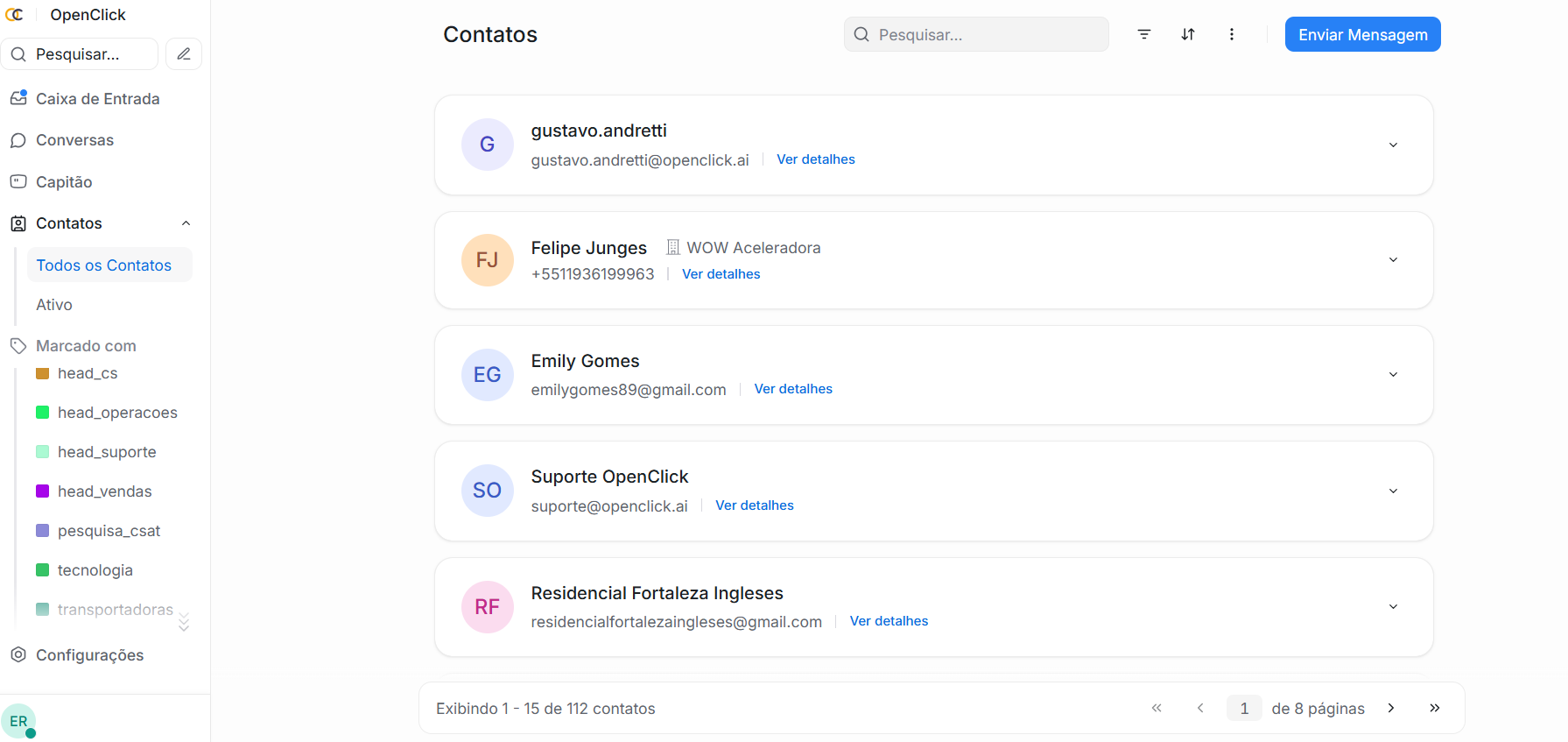 Para visualizar a tela de Contatos, clique na aba "Contatos" na barra lateral esquerda do seu painel. Esta é a aparência típica de uma tela de contatos: