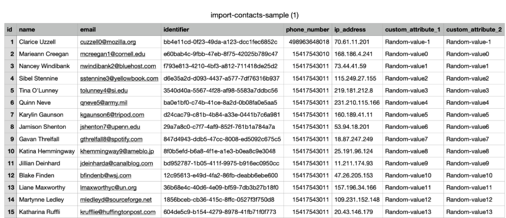 Passo 2. Selecione um arquivo CSV do seu sistema para enviá-lo ao banco de dados do Clickdesk. Veja como fica um banco de dados de exemplo: