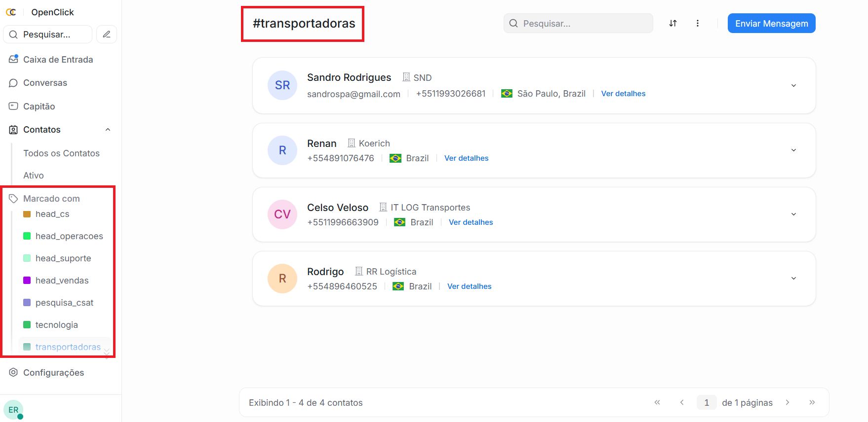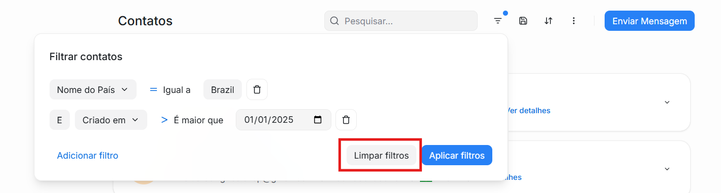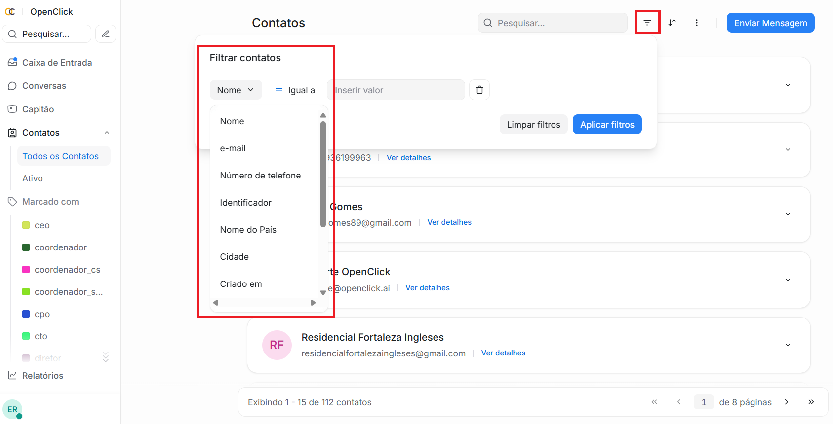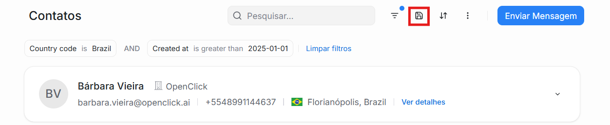 Passo 4. Clique no botão "Enviar". Você será redirecionado para a tela de Contatos e verá apenas os contatos qualificados pelos filtros selecionados.