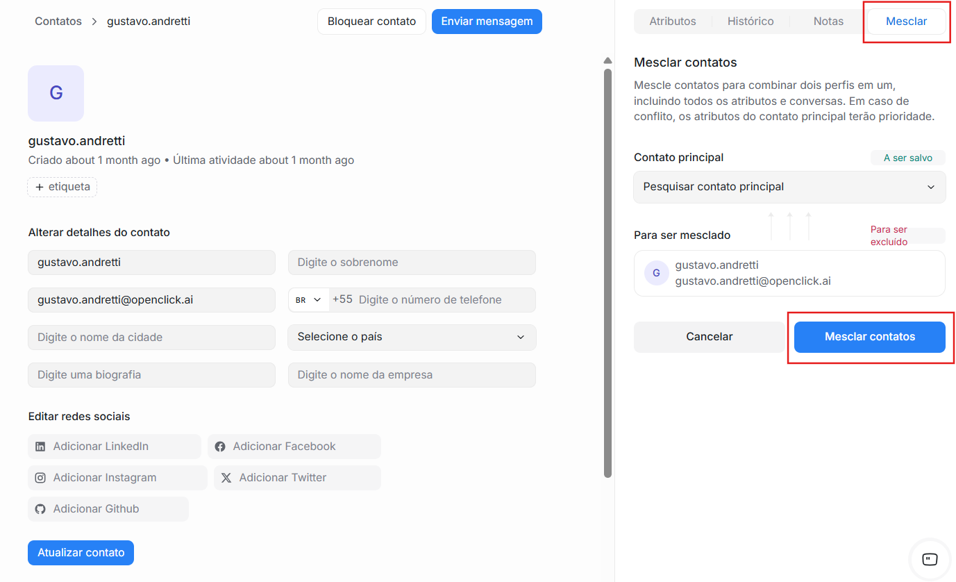 Mesclar é recurso que unifica dois contatos distintos em um só, para não ficar com duplicidade na base. Após a mesclagem, o Clickdesk mantém um único registro do cliente, juntando o histórico de conversas e dados.