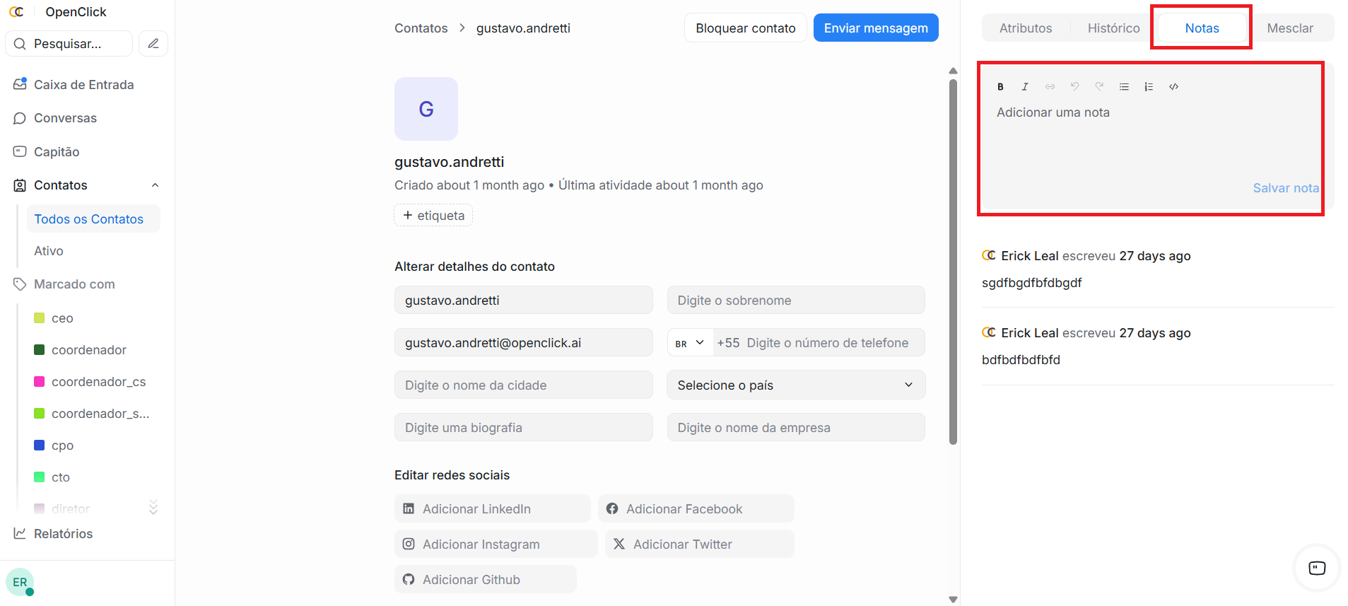 Você pode adicionar notas e informações importantes a um contato específico. Você pode usar isso para registrar manualmente uma chamada, e-mail ou reunião com o cliente.