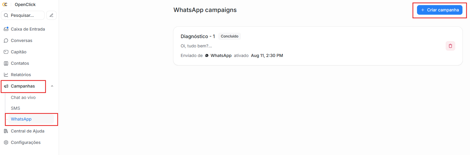 Acesse Campanhas do WhatsApp no seu painel do Clickdesk, clique em WhatsApp como canal e crie uma nova campanha em "+ Criar campanha".
