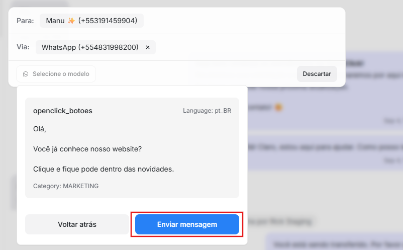 Em seguida clique em "Selecione o modelo" e escolha qual template será enviado para o cliente. Depois só clicar em "Enviar template".