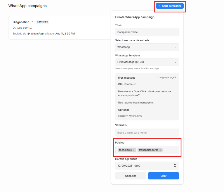 Escolha seu modelo do WhatsApp entre as opções disponíveis e configure seu público e os parâmetros do modelo.