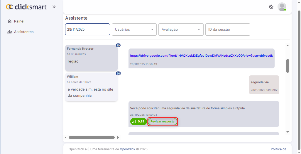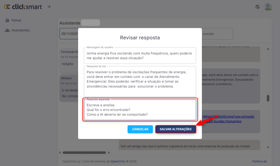 Revisar resposta — Função usada para enviar ao time OpenClick uma revisão sobre determinada mensagem da IA.