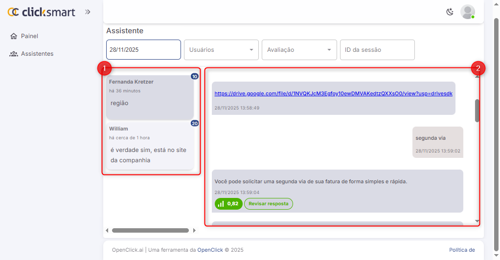 A validação das interações da IA é uma parte essencial do processo de melhoria contínua. Sempre que uma resposta não corresponde ao comportamento esperado, o usuário pode solicitar que o time OpenClick analise a interação. Este manual ensina, passo a passo, como abrir uma solicitação utilizando a função de revisão de resposta diretamente pelo Clicksmart.