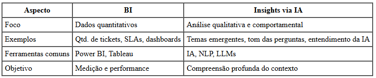 Muitos usuários confundem Insights com Business Intelligence (BI). Abaixo está uma tabela comparativa para esclarecer: