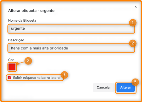 Na janela de alteração de etiqueta, altere o Nome da Etiqueta (Item 1), a Descrição (Item 2) e, caso necessário, altere a Cor (Item 3).