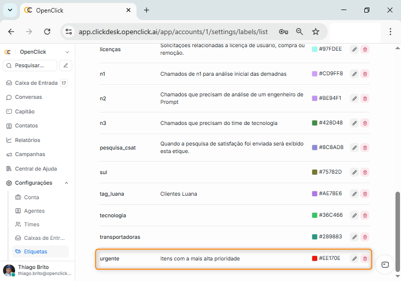 Alterando uma etiqueta no Clickdesk