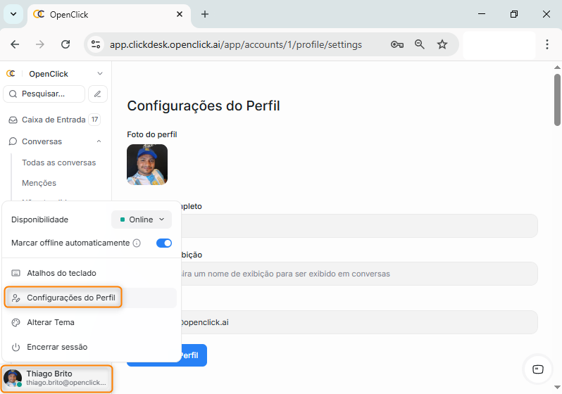 A alteração do perfil é fundamental para garantir correta identificação nos atendimentos, além de proporcionar uma experiência de uso personalizada, sem impactar permissões ou configurações globais da conta. O perfil do agente reúne informações e configurações individuais utilizadas pelo sistema, como: