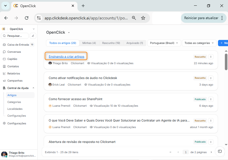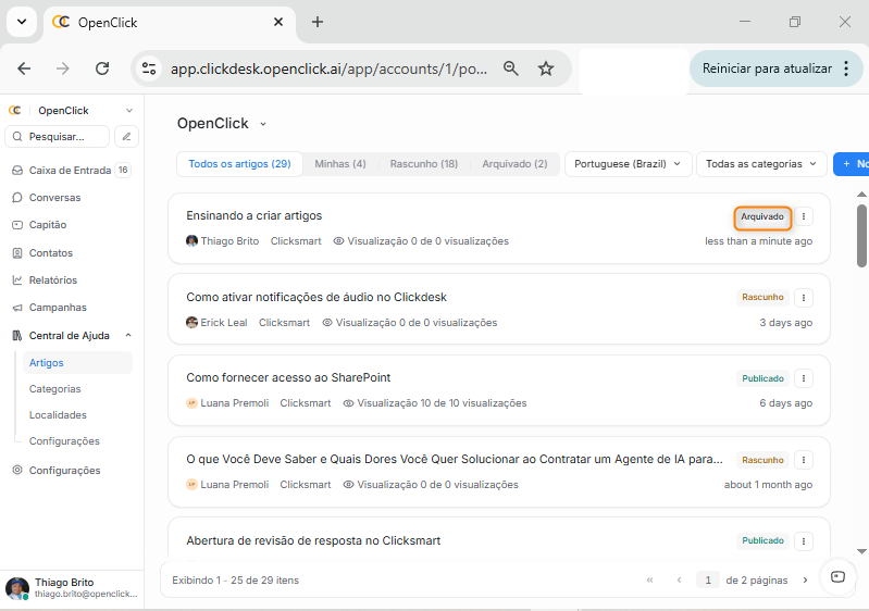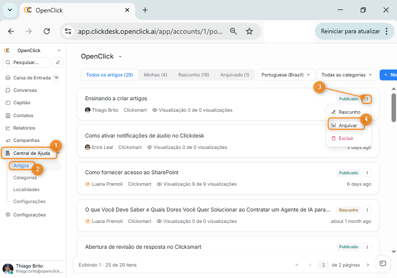 Este artigo explica como arquivar artigos na base de conhecimento do Clickdesk.