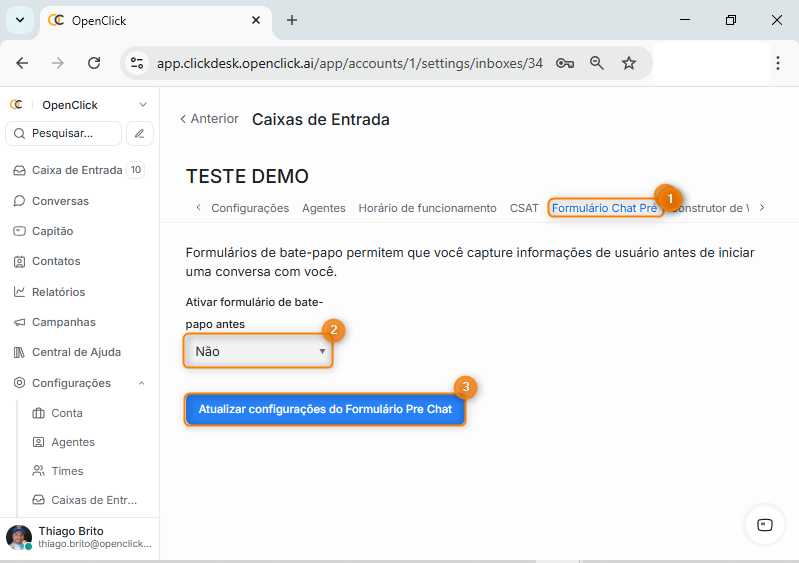NOTA: Essa opção controla o uso do formulário pré-chat para a caixa de entrada selecionada e impacta diretamente a coleta de informações iniciais do usuário.