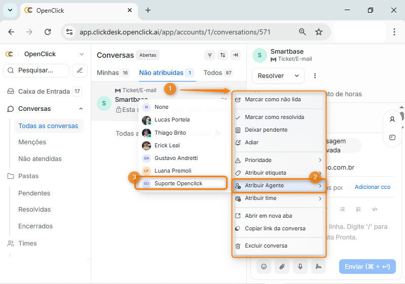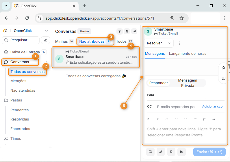 No menu principal, acesse a área de Conversas. (Item1), no agrupamento Todas as conversas (Item 2) é possível visualizar todas as solicitações que não foram atribuídas no agrupamento central de nome Não atribuídas (Item 3).