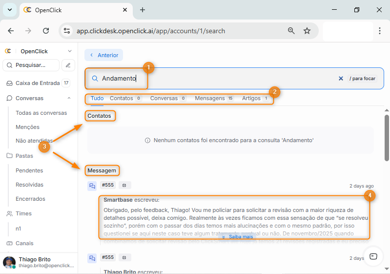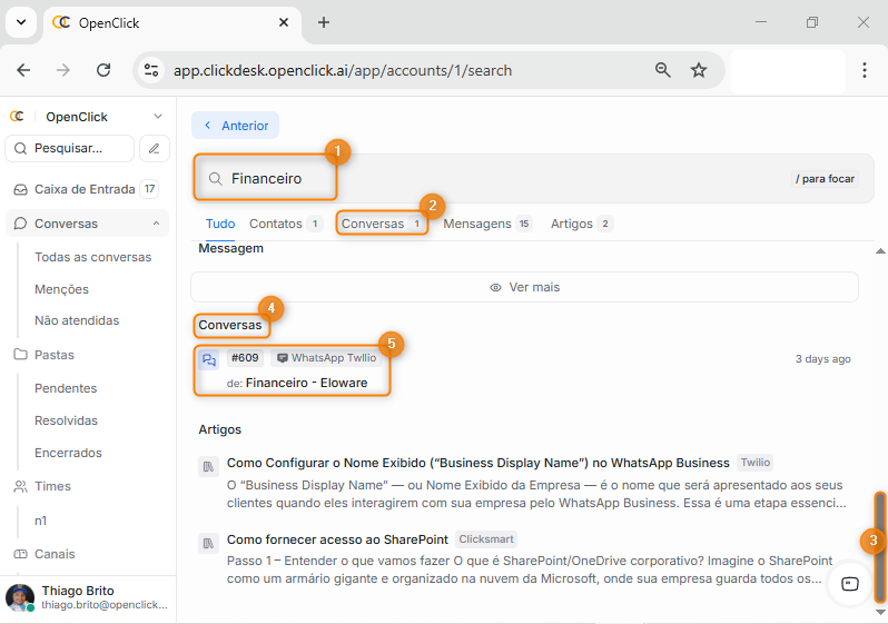 Quando pesquisar algum conteúdo que possua resultado em algum ticket (Item 1), será apresentado a numeração de itens na frente do filtro de cabeçalho Conversas (Item 2)
