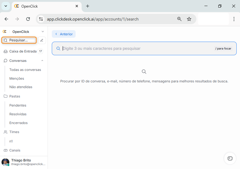 NOTA: O Clickdesk aconselha procurar por ID de conversa, e-mail, número de telefone, mensagens para melhores resultados de busca.