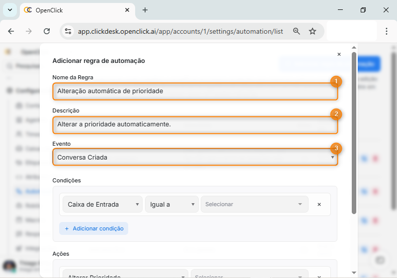 Dentro da tela Automação, clique em Adicionar regra de automação (Item 3).
