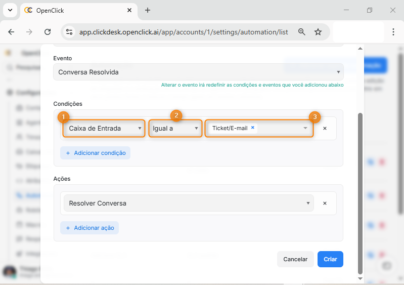 Dentro da tela Automação, clique em Adicionar regra de automação (Item 3).