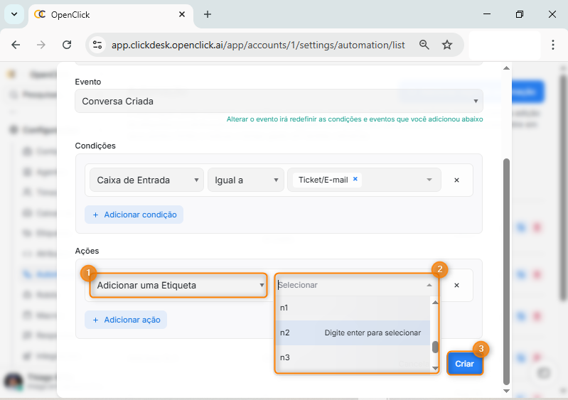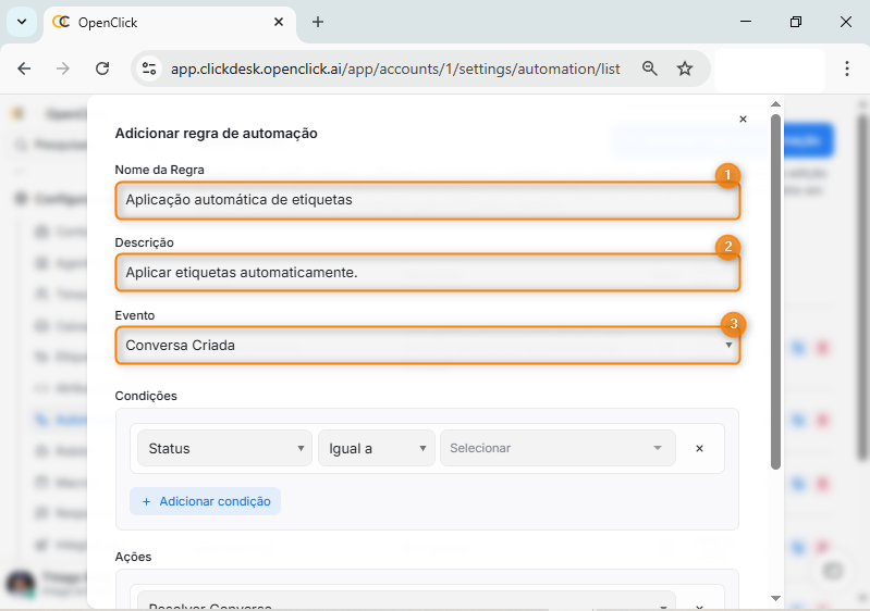 A aplicação automática de etiquetas é uma funcionalidade de automação que adiciona uma etiqueta pré-definida a uma conversa assim que ela é criada, desde que atenda às condições configuradas. Essa configuração permite que conversas sejam classificadas automaticamente no momento em que entram no sistema, garantindo organização, padronização e melhor aproveitamento de filtros e relatórios.