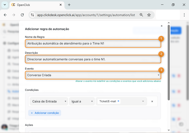 Dentro da tela Automação, clique em Adicionar regra de automação (Item 3).