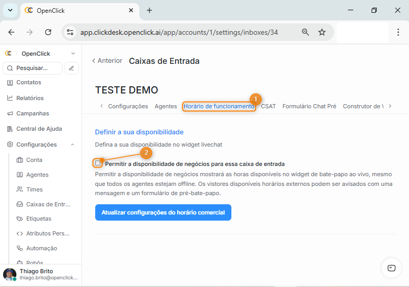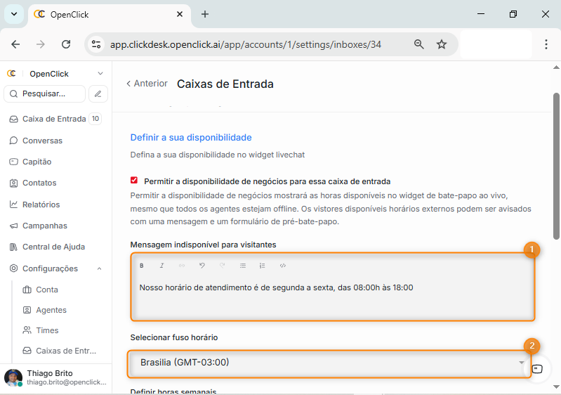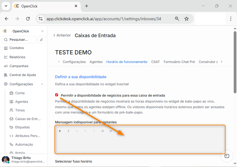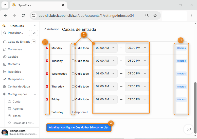 NOTA: Apenas usuários com permissão administrativa podem configurar o horário de atendimento, Agentes não possuem acesso a essa configuração.