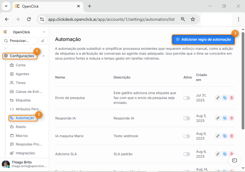 Dentro da tela Automação, clique em Adicionar regra de automação (Item 3).