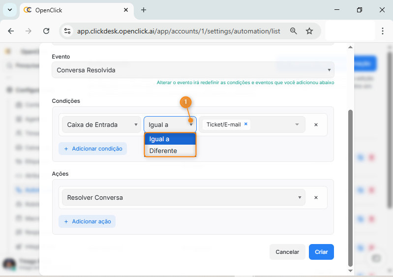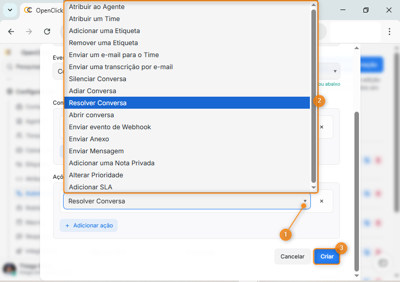 O encerramento automático é uma configuração de automação que executa a ação “Resolver Conversa” quando uma conversa atende a critérios específicos definidos pelo sistema. Esse recurso permite que conversas sejam encerradas automaticamente quando determinados eventos ocorrem, reduzindo tarefas manuais e garantindo padronização no fluxo de atendimento.