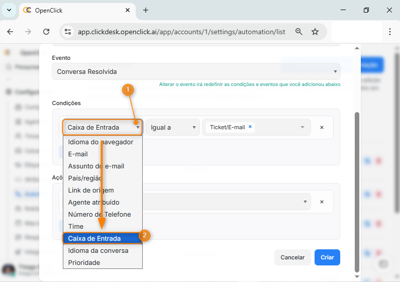 Ao configurar uma condição do tipo Caixa de Entrada, o Clickdesk exibe uma lista para você escolher quais caixas de entrada a regra deve considerar. Essa seleção define de onde a conversa/ticket precisa ter vindo para que a automação seja aplicada. Selecione entre: