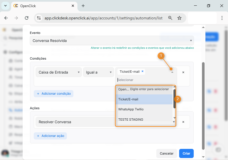 Na seção Ações, clique na seta para baixo (Item 1) e selecione a ação que será executada (Item 2). Entre as ações disponíveis estão: