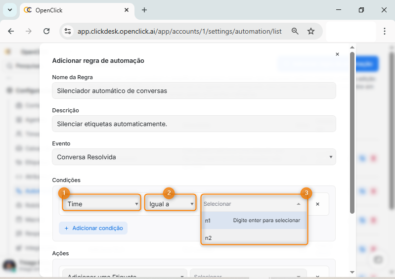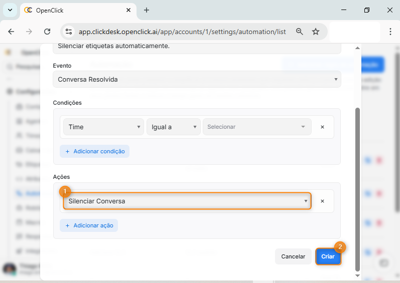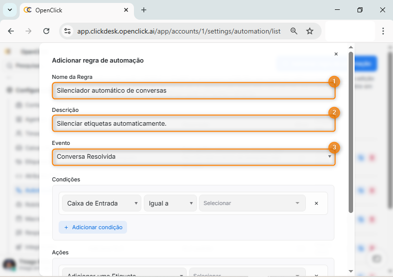 O silenciamento automático é uma ação de automação que impede que uma conversa continue gerando notificações após ser resolvida. Essa configuração evita notificações desnecessárias em conversas já tratadas, contribuindo para um ambiente de atendimento mais organizado e com menos ruído operacional.