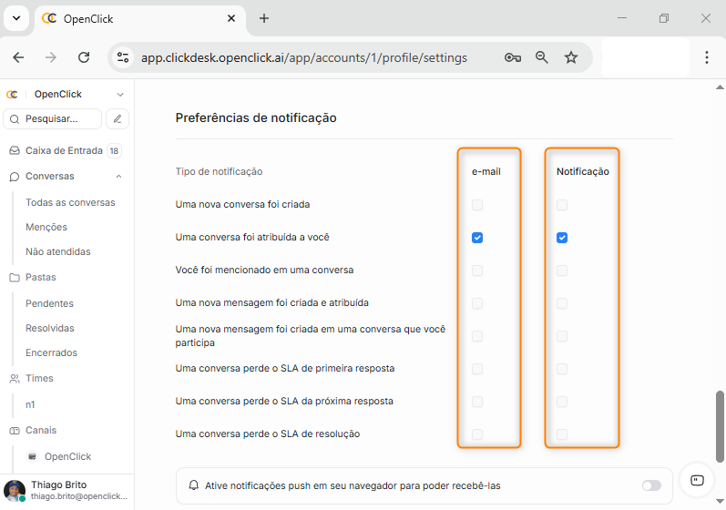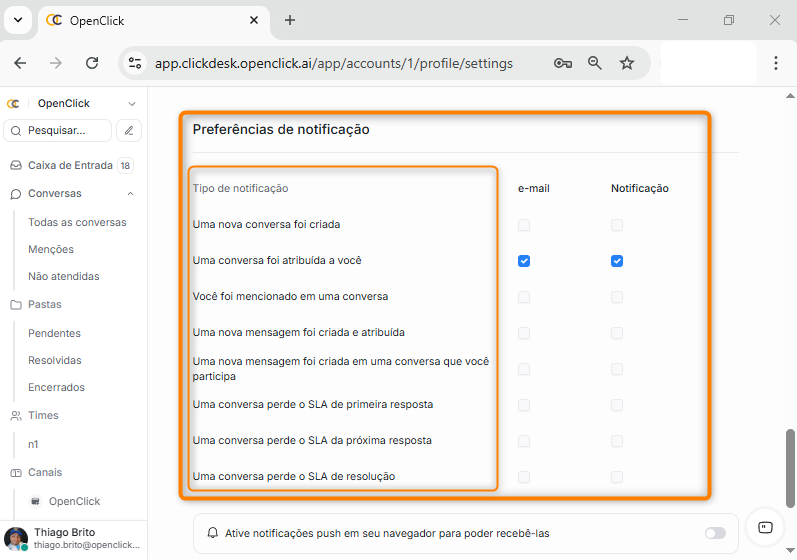 Esta seção permite configurar quando o usuário receberá notificações relacionadas às conversas no Clickdesk e por qual canal (e-mail e/ou notificação no sistema).Cada linha representa um evento, e cada coluna define como o usuário será avisado.