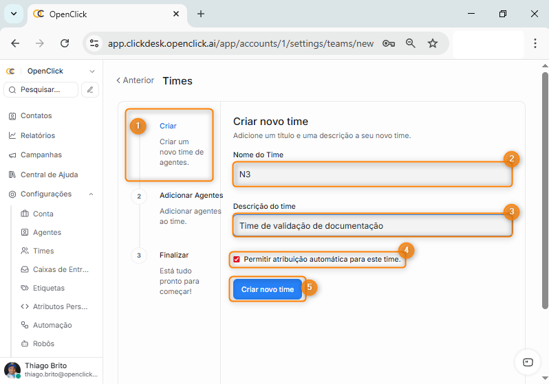 O checkbox Permitir atribuição automática para este time (item 4) define se o Clickdesk poderá distribuir atendimentos automaticamente entre os agentes que fazem parte do time. Quando ativada, essa opção permite que o sistema atribua conversas de forma automática, considerando as configurações gerais de atribuição e a disponibilidade dos agentes; quando desativada, o time não receberá atribuições automáticas, sendo necessário que a definição do agente responsável seja feita manualmente, o que é indicado para times de análise, validação ou atividades que exigem triagem prévia. Selecione ou não dependendo da sua necessidade.