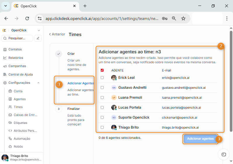 No segundo agrupamento de nome Adicionar Agentes (item 1), selecione um ou mais agentes através do checkbox de cada agente (item 2) , Clique no botão Criar novo time (Item 3).