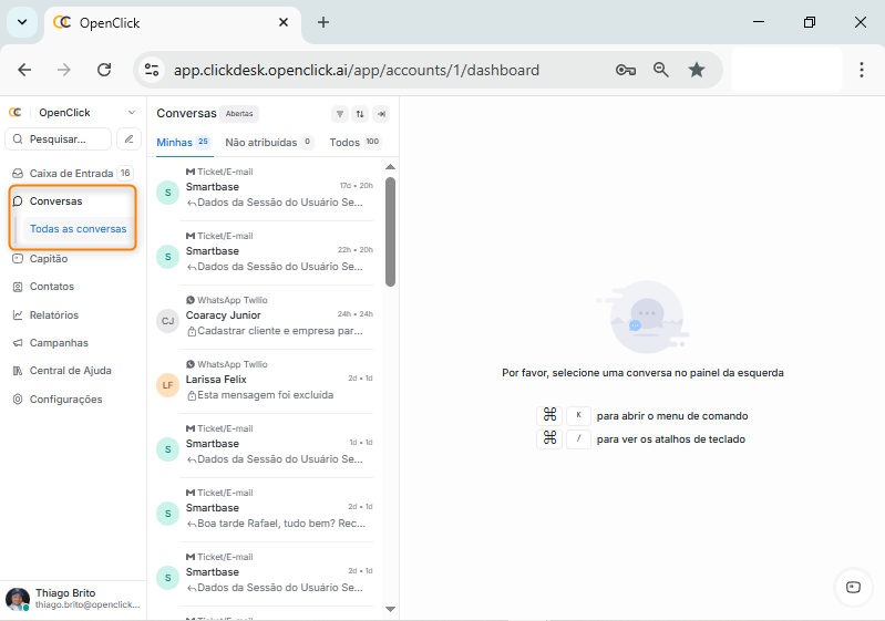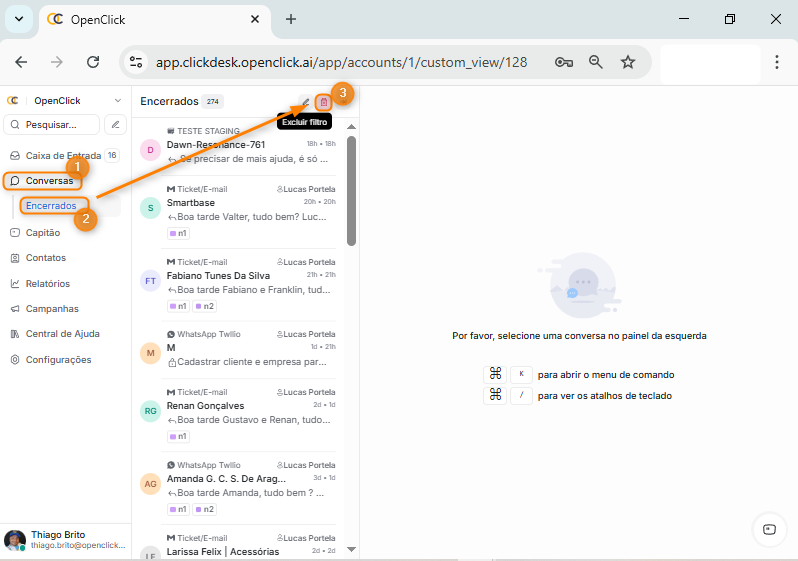 A partir da tela inicial do clickdesk, selecione o menu lateral Conversas (Item 1), e o submenu lateral Com o nome do filtro salvo (Item 2).