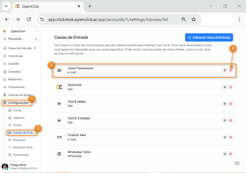 Na tela Caixas de entrada, selecione a caixa que será excluída (Item 3), clique na lixeira (Item 4).