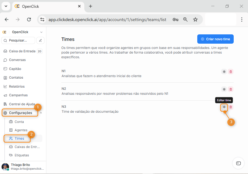 Selecione a seção Times (Item 2) e selecione o botão Engrenagem do time que gostaria de habilitar atribuição automática (Item 3).
