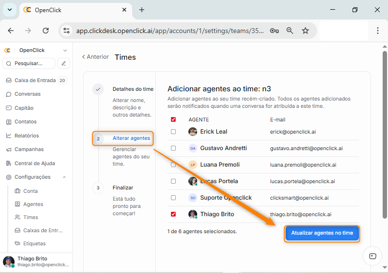 Assim que atualizado, o sistema apresenta o segundo agrupamento, clique em Atualizar agentes do time