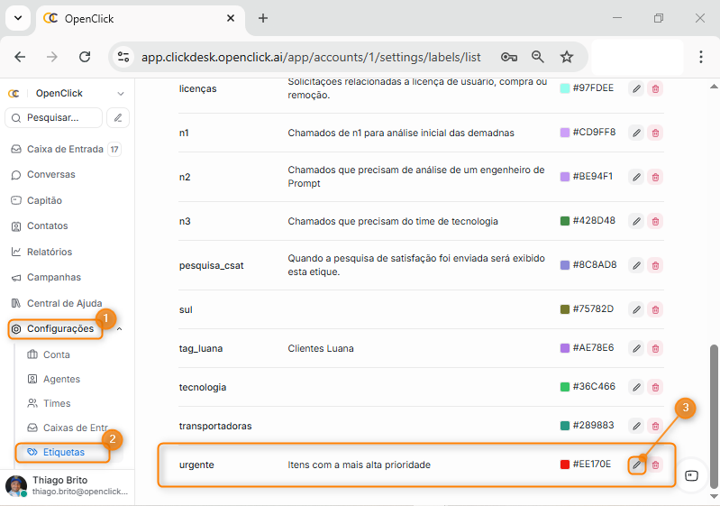 Na linha da etiqueta que gostaria de realizar a alteração, clique no ícone Lápis (Item 3).