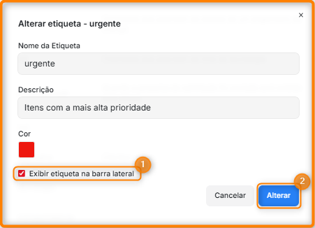 Na janela de alteração de etiqueta, é possível visualizar o checkbox Exibir etiqueta na barra lateral (Item 1). Marque ou desmarque o chekbox conforme a sua necessidade.