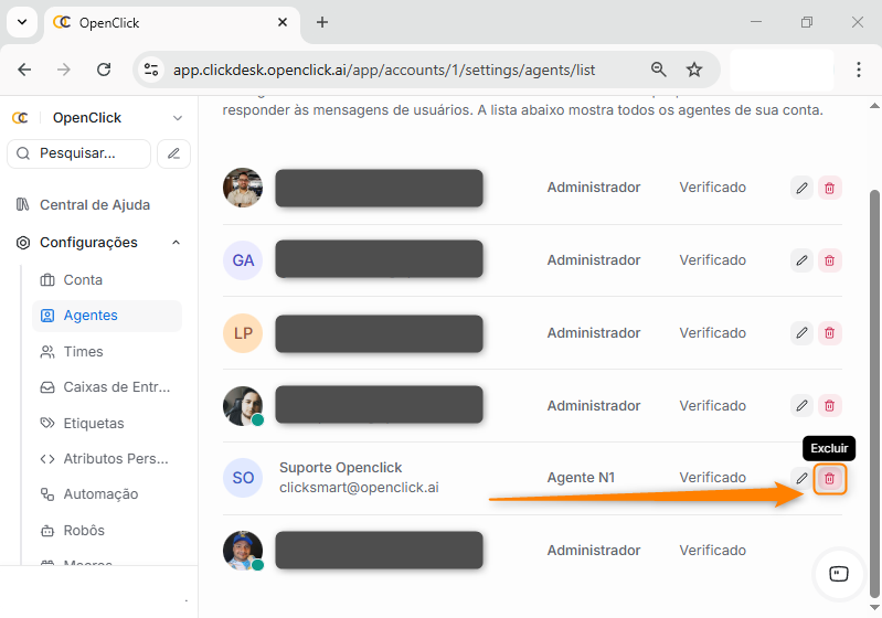 Clique no ícone de lixeira da linha do agente na qual deseja remover.
