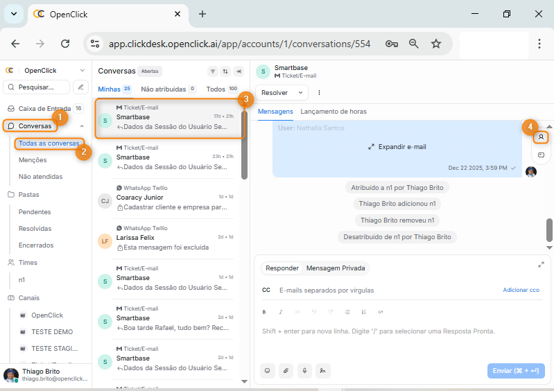 Na tela inicial do clickdesk, acesse a área de Conversas (Item 1), selecione o submenu Todas as conversas (Item 2)