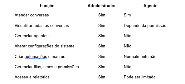 Em resumo, o agente atende clientes, mas não administra a plataforma.