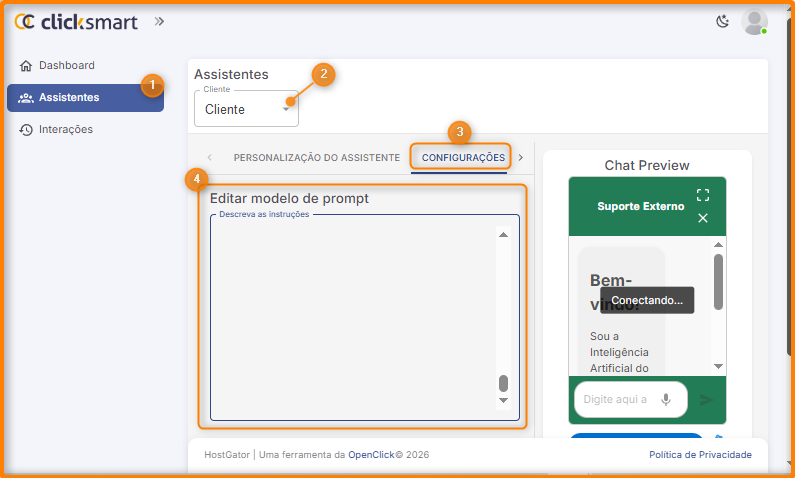 Este manual explica como escrever instruções claras, previsíveis e seguras no campo editar o modelo de prompt do Clicksmart.